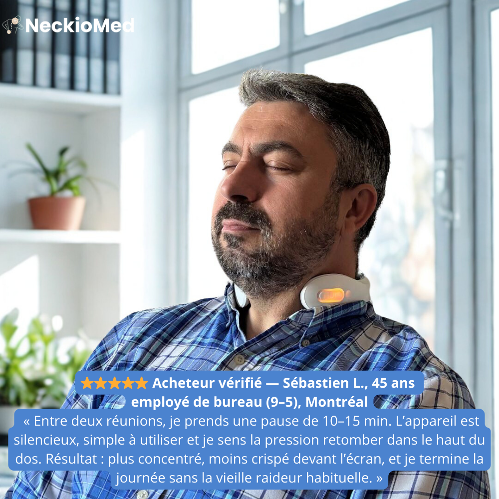 NeckioMed combine une chaleur apaisante et des micro-stimulations réglables pour atténuer la raideur et délasser les épaules en quelques minutes.